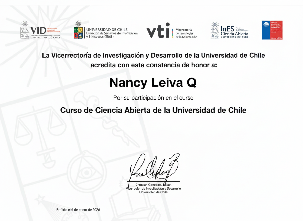 ✅ Certificada en Ciencia Abierta – Universidad de Chile (enfoque en democratización y transparencia del conocimiento)